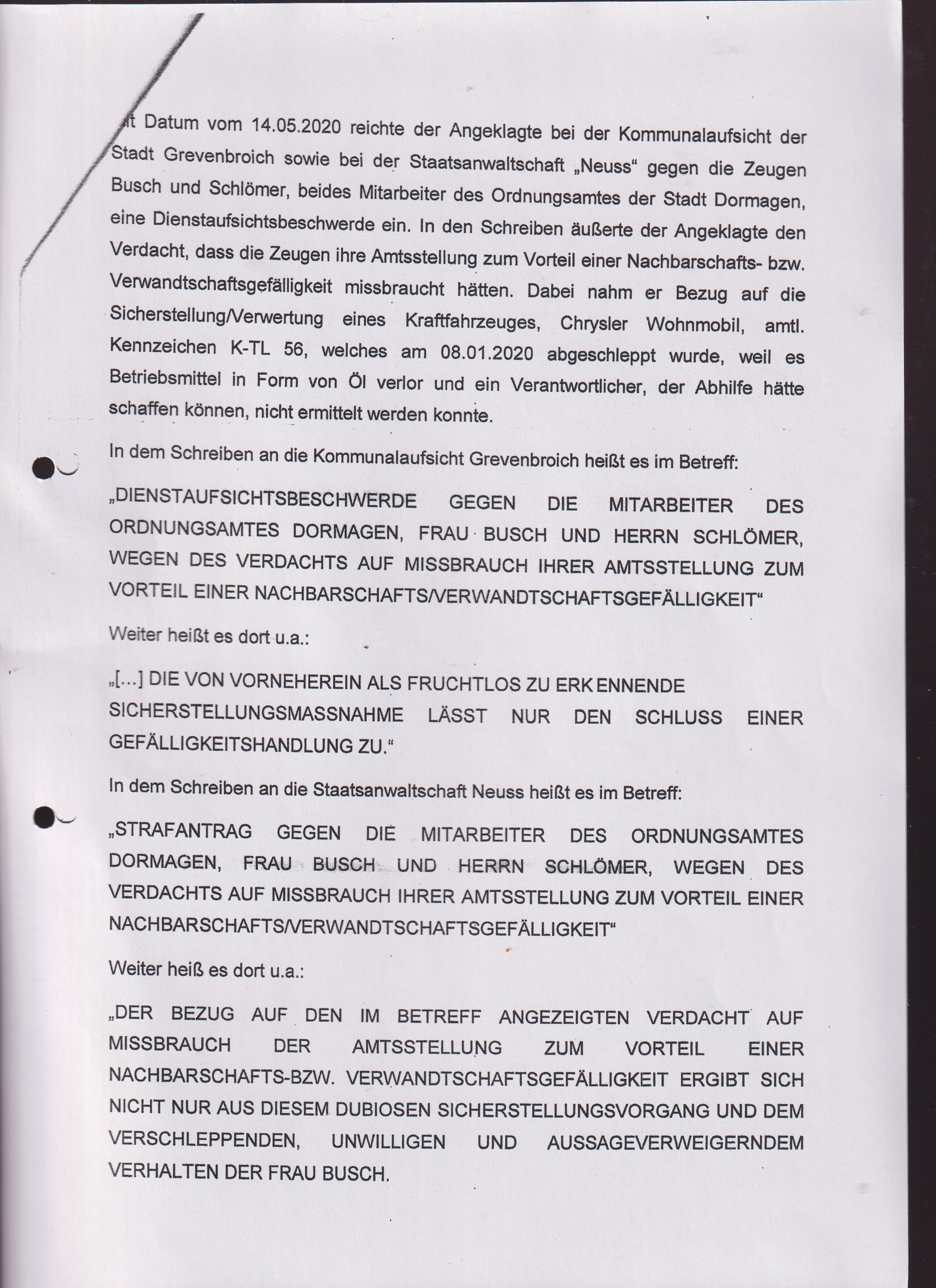 STRAF A N T R A G GEGEN DIE MITARBEITER DES ORDNUNGSAMT DORMAGEN,